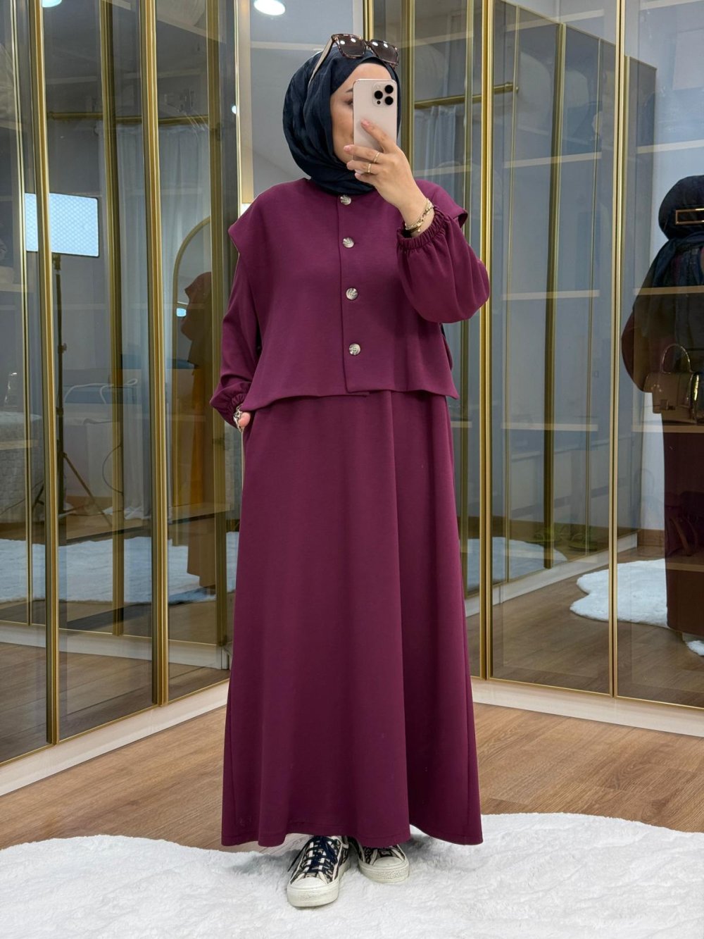 Asimetrik Düğme Detaylı Yelek Elbise Mürdüm