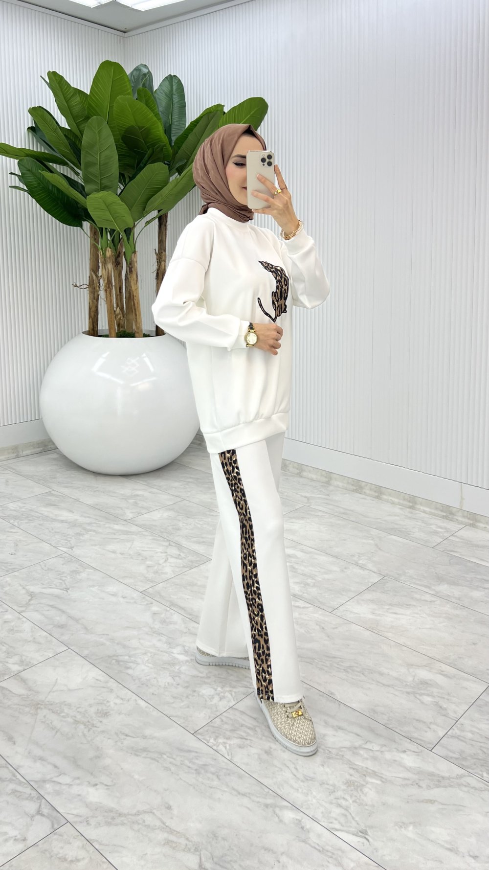 Beyaz Leoparlı Scuba Takım Tesettür Giyim