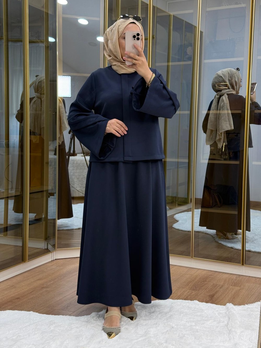 Çiçek Broş Detaylı Scuba Etekli Takım Lacivert