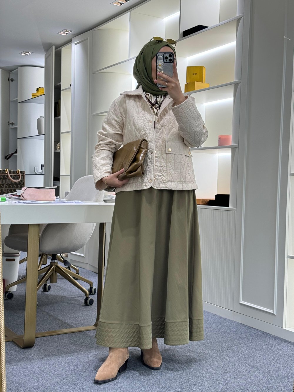 Dikiş Detaylı Beli Lastikli Etek Haki