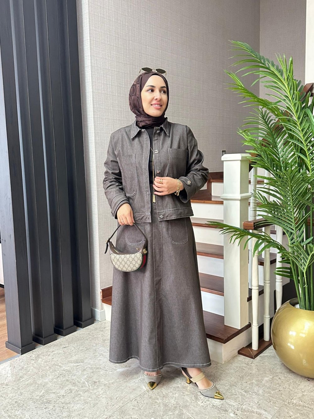 Kontrast Dikişli Kot Etekli Takım Kahverengi