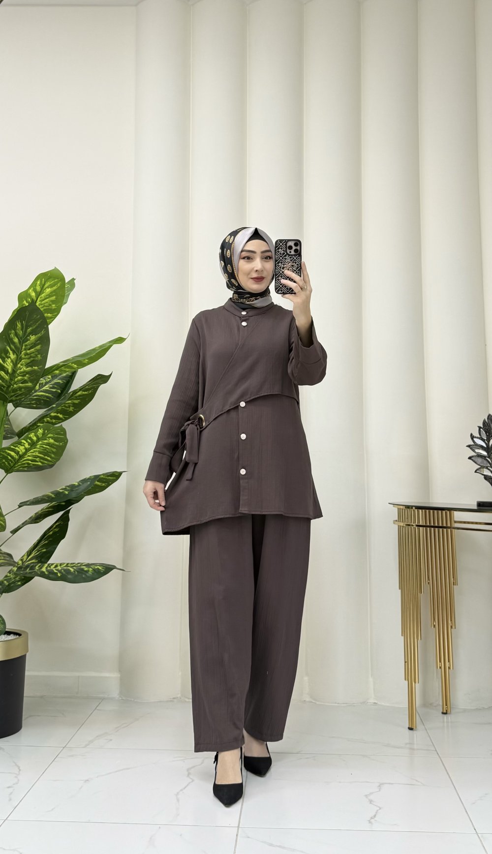 Minimal düğme detaylarıyla sade ama güçlü bir stil yaratır.