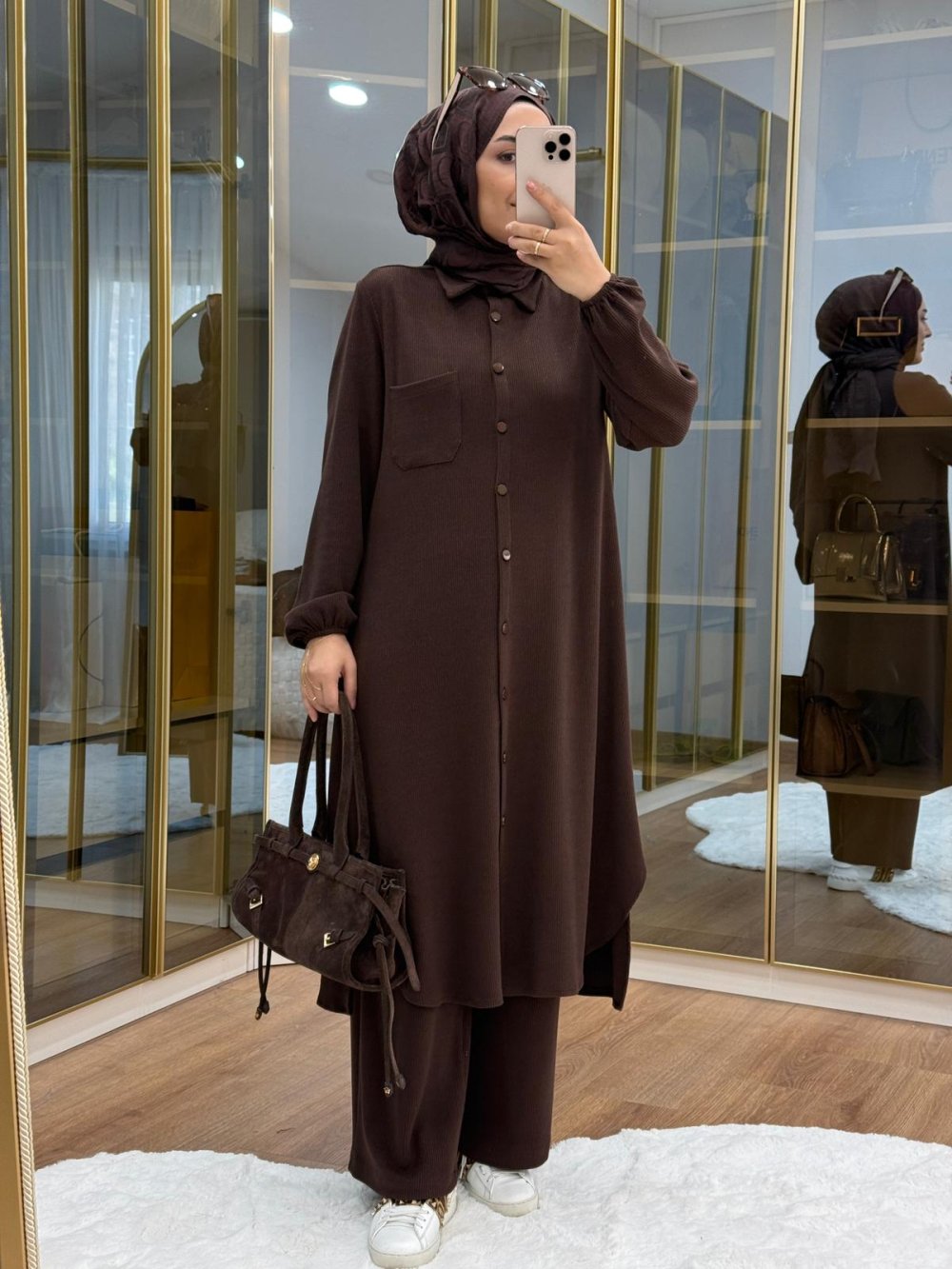 Örme kumaş maksi boy takım Kahverengi