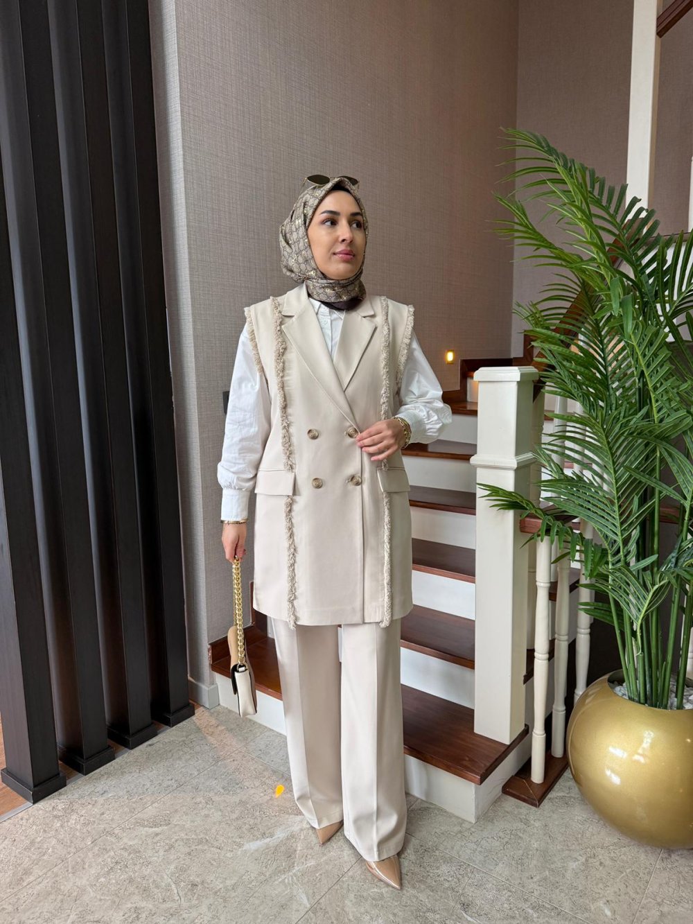 Yelek komple astarlıdır, püskül detaylıdır, boy uzunluğu 85 cm’dir.