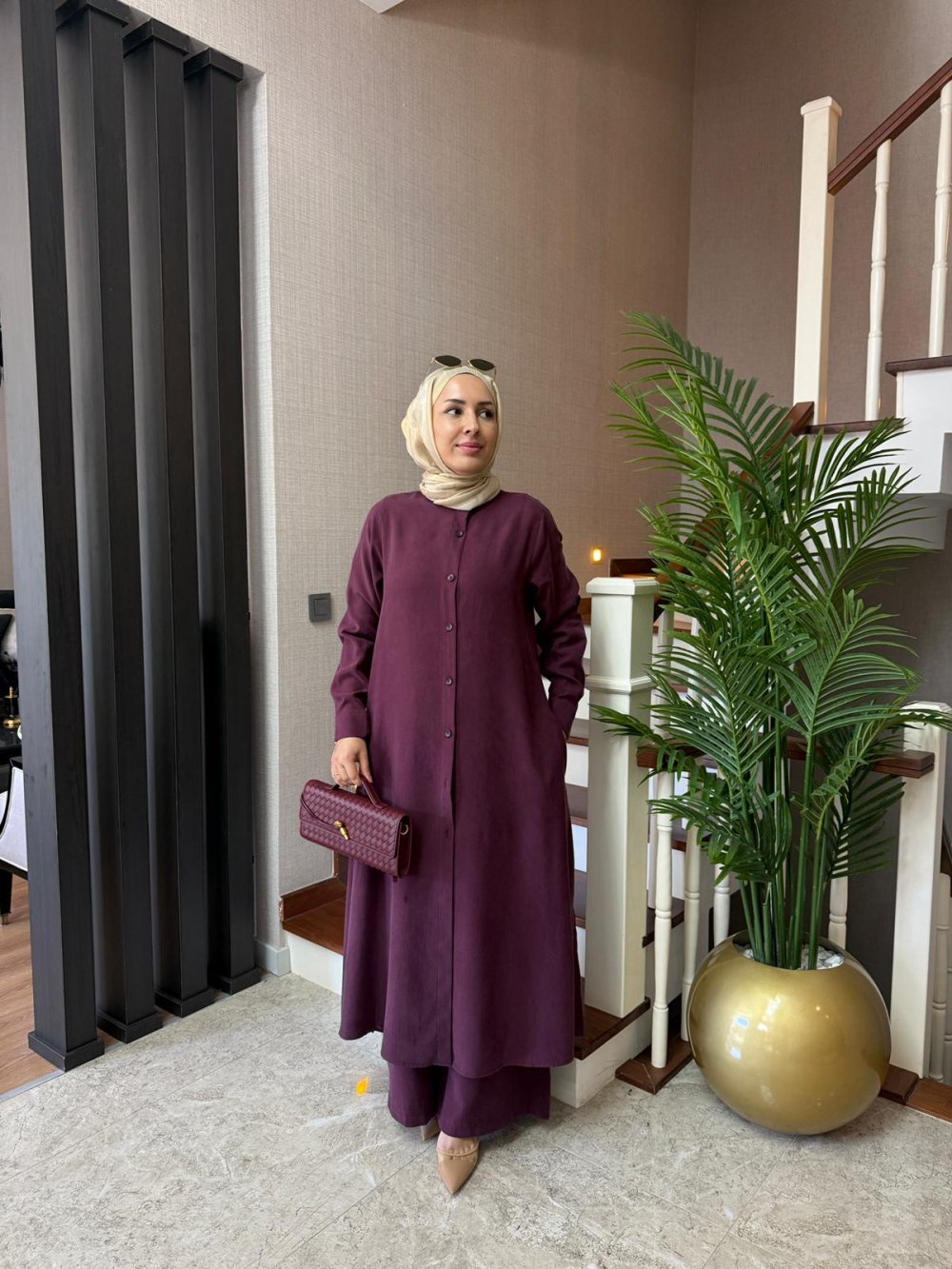 Tunik boy 125 cm’dir. Önden düğmeli, yanında cepleri ve yırtmaçları mevcuttur.