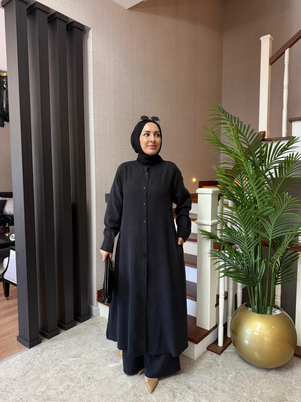 Tunik boy 125 cm’dir. Önden düğmeli, yanında cepleri ve yırtmaçları mevcuttur.