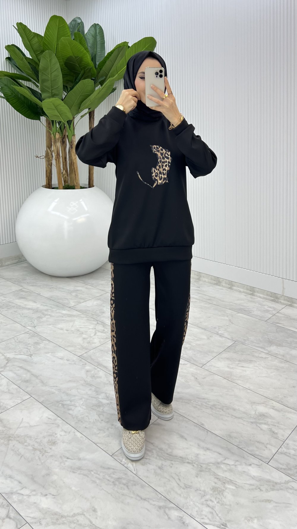 Siyah Leoparlı Scuba Takım Tesettür Giyim