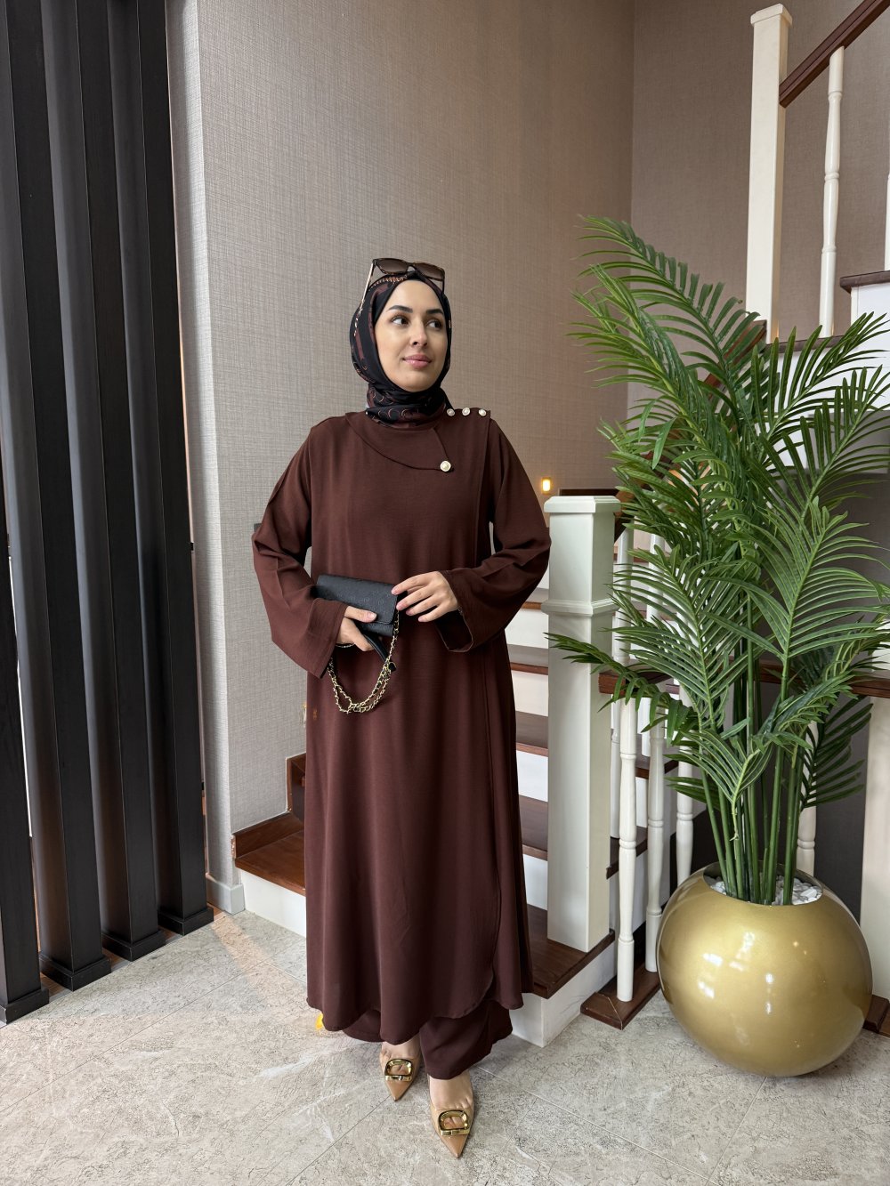 Tunik boy 125 cm’dir. Kruvaze kapama şeklinde gelmektedir, omuzunda düğme detayları mevcuttur.