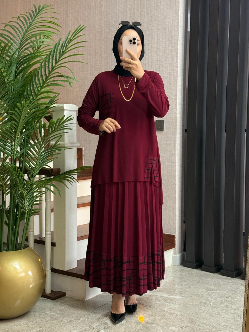 Yırtmaçlı Tilda Etekli Takım Bordo
